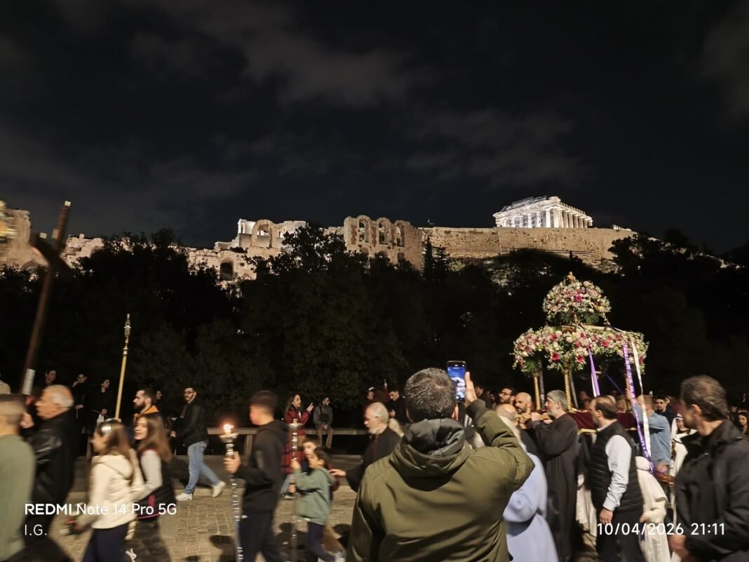 Οι δρόμοι Ι. Μακρυγιάννη και Δ. Αρεοπαγίτου γέμισαν από πλήθος πιστών με αναμμένα κεριά στα χέρια, που έψαλαν το «Η ζωή εν τάφω…» και το «Αι γενεαί πάσαι..» με φόντο τη λαμπερή Ακρόπολη. Η πορεία για τη συνάντηση των άλλων επιταφίων των Ι.Ν. του Αγ. Δημητρίου του Λουμπαρδιάρη και της Αγίας Σοφίας κατέληξε στου Φιλοπάππου με κορύφωση την κοινή δέηση.