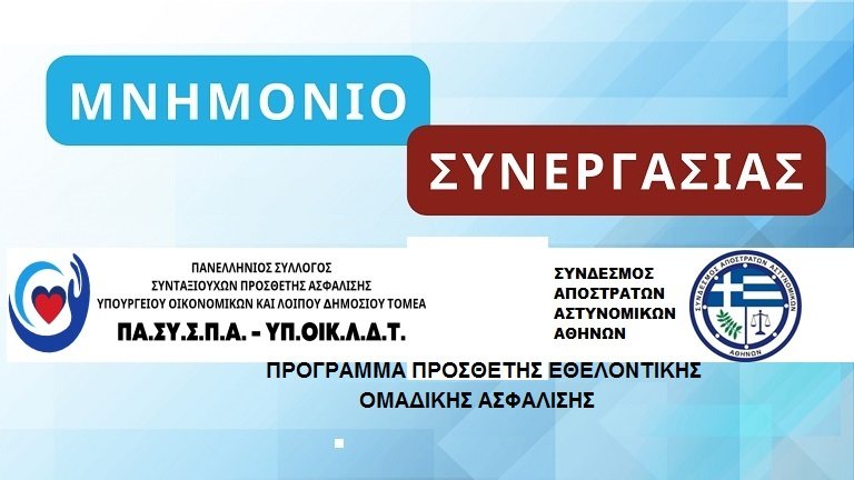 Το Διοικητικό Συμβούλιο του Συνδέσμου Αποστράτων Αστυνομικών Αθηνών ενεργώντας σύμφωνα με το Καταστατικό και στην προσπάθεια για τη βελτίωση της κοινωνικής θέσης και της υγειονομικής και νοσοκομειακής περίθαλψης των μελών του, σας ενημερώνει δημόσια ότι πέτυχε την ισότιμη συμμετοχή των Μελών μας στο πρόγραμμα Εθελοντικής Ομαδικής Ασφάλισης της εταιρείας Allianz που συνεργάζεται με τον Πανελλήνιο Σύλλογο Συνταξιούχων Πρόσθετης Ασφάλισης Υπουργείου Οικονομικών και Λοιπού Δημοσίου Τομέα ΠΑ.ΣΥ.Σ.Π.Α.-ΥΠ.ΟΙΚ.Λ.Δ.Τ. Για αυτή την Εταιρική Κοινωνική Σχέση συντάχθηκε και υπογράφηκε αμοιβαίο Μνημόνιο Συνεργασίας με τον ανωτέρω Πανελλήνιο Σύλλογο την 24/7/2025 και έχει ληφθεί υπόψη η νομοθεσία των ευαίσθητων προσωπικών δεδομένων. (sapasa.gr, Ενότητα Σ.ΑΠ.ΑΣ.Α./Μνημόνιο Συνεργασίας).
